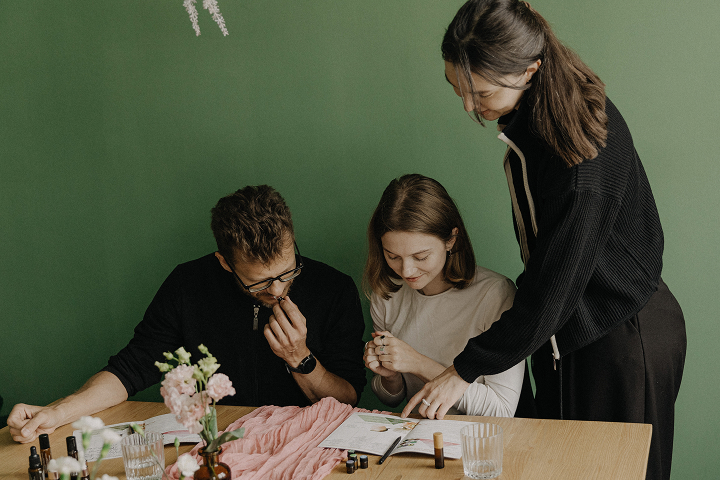 - Перед созданием парфюма ароматерапевт проводит обучение и диагностику участников.