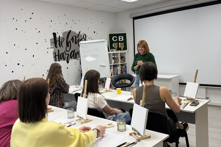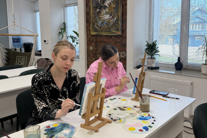 В студии ожидает мольберт, профессиональный художественный инвентарь и приятная музыка.